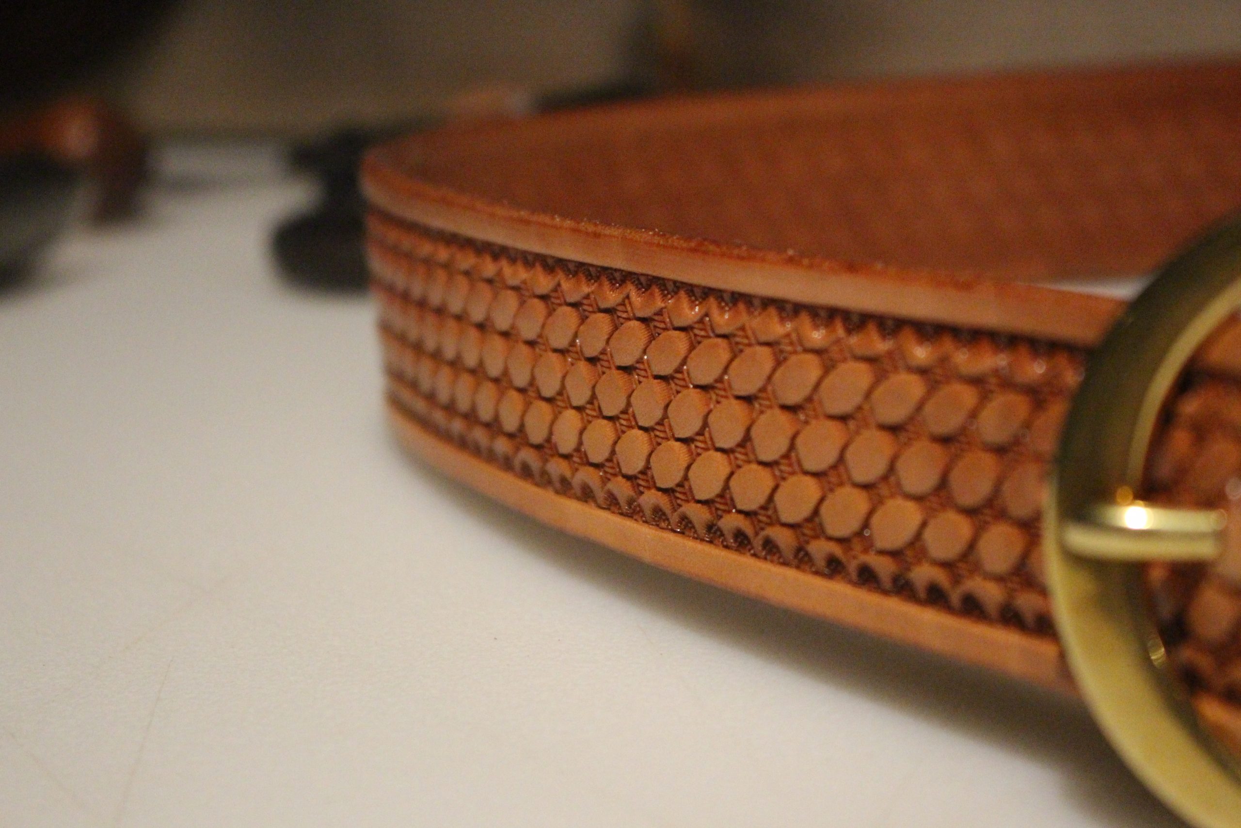 We offer hand basket-stamping for the main strap at an additional cost.  Most basket-stamping that you see on products in stores is done by machine.  The benefit of a hand basket-stamped product is that each stamp is far more well-defined than a machine pressed pattern.  Hand basket-stamping is a labor intensive process, but it does create a stunning product.